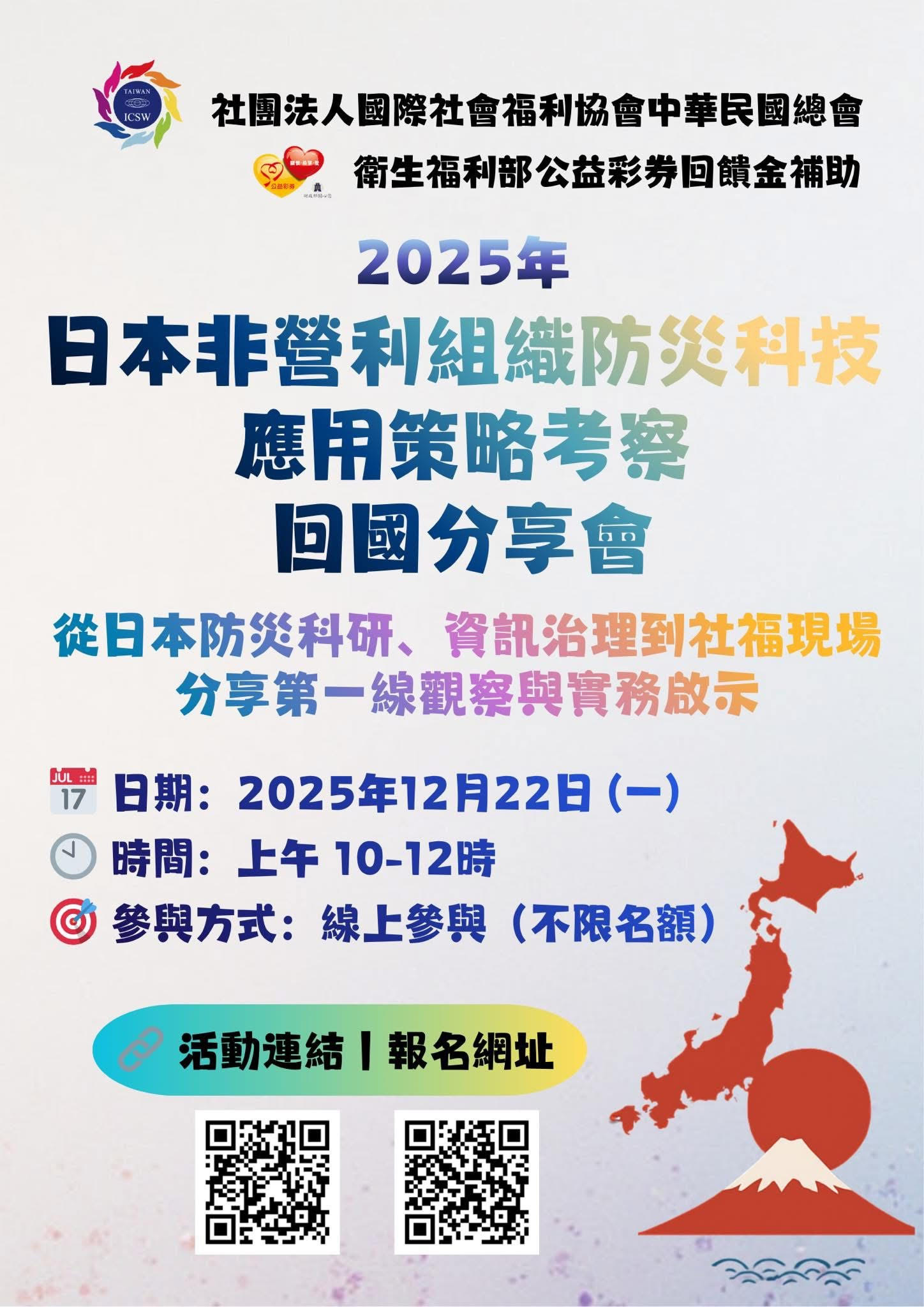 為分享此次出訪成果,並促進更多實務與經驗交流,特舉辦回國線上分享會,敬邀所有關注 防災科技 × 社福服務 × 公私協力 之夥伴一同參與。